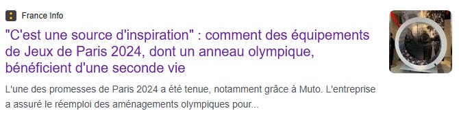 L'une des promesses de Paris 2024 a été tenue, notamment grâce à Muto. L'entreprise a assuré le réemploi des aménagements olympiques pour les distribuer gratuitement à des acteurs de l'économie sociale et solidaire. Un anneau olympique a ainsi été transformé en œuvre d'art.