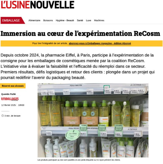 Depuis octobre 2024, la pharmacie Eiffel, à Paris, participe à l’expérimentation de la consigne pour les emballages de cosmétiques menée par la coalition ReCosm. L'initiative vise à évaluer la faisabilité et l’efficacité du réemploi dans ce secteur. Premiers résultats, défis logistiques et retour des clients : plongée dans un projet qui pourrait redéfinir l’avenir du packaging beauté.